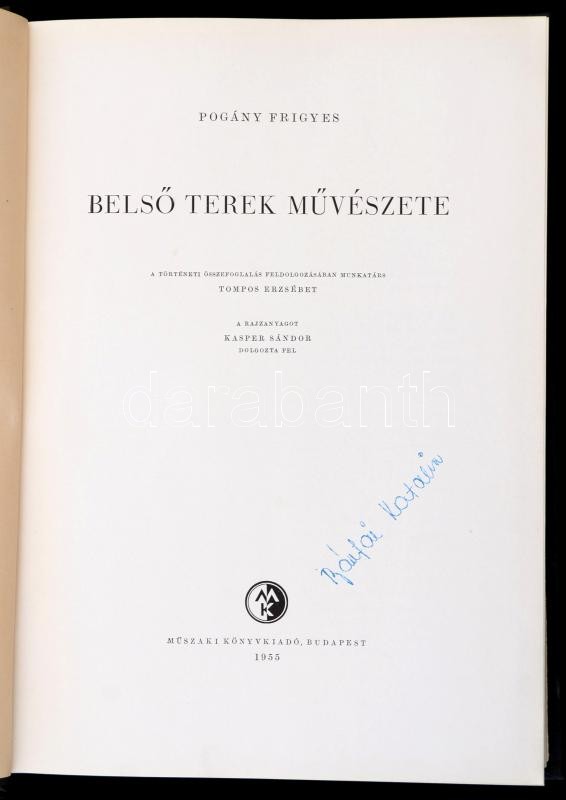 Pogány Frigyes: BelsÅ‘ terek művészete. A történeti összefoglalás feldolgozásában munkatárs Tompos Erzsébet. A rajzanyagot Kasper Sándor dolgozta fel. Bp., 1955, Műszaki. Kiadói egészvászon-kötés, kissé kopott gerinccel és borÃtóval.