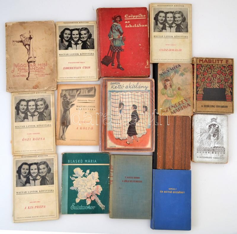 1945 előtti romantikus ifjúsági könyvek, 15 db: B.Czeke Vilma: A megváltó csillaga, Damon, Marjorie: Kettő a kislány, Estrid Ott: Három leány egy autóban, Nagy Méda: Szendrey Marika, Blaskó Mária: Magyar Misi kalandjai a vörös világban, T. Kovács Hermin: A zöld selyemruha, stb.