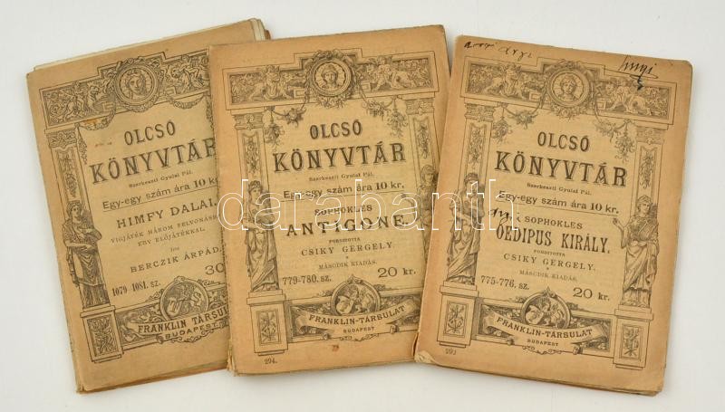 Description: Az Olcsó könyvtár sorozat 3 füzete: Berczik Árpád: Himfy dalai (1899); Sophokles: Antigone (1891); Sophokles: Oedipus király (1891). Papírkötésben, példányonként változó állapotban.