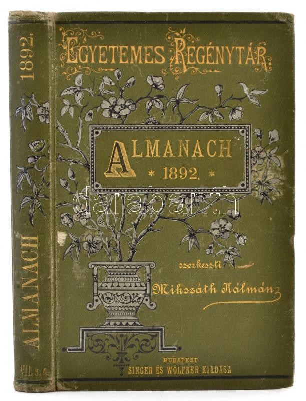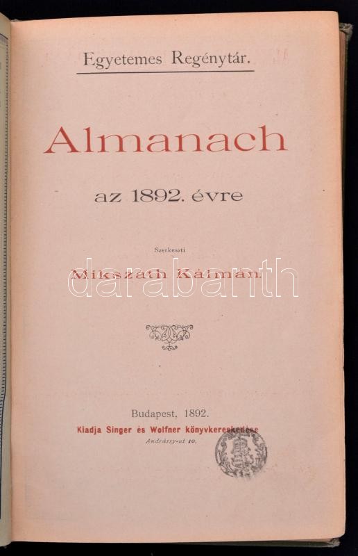 Egyetemes Regénytár. Almanach az 1892. évre. Szerkeszti Mikszáth Kálmán. Bp., 1892, Singer és Wolfner. Kiadói aranyozott, festett, illusztrált egészvászon, kissé kopott, kissé foltos borÃtóval, a cÃmlapon m. kir. naptárbélyeg pecséttel.