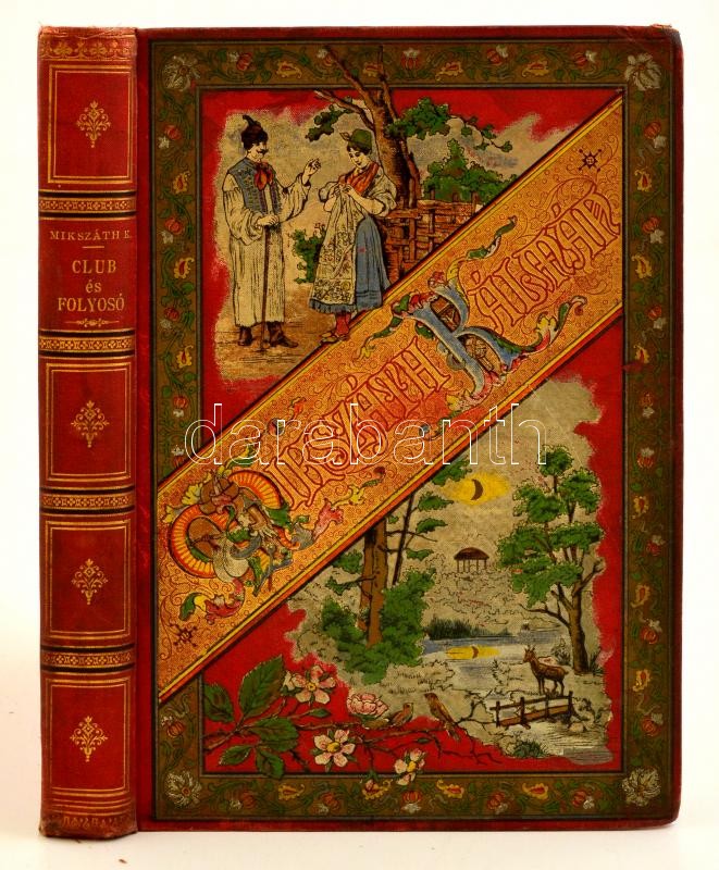 Mikszáth Kálmán: Club és folyosó. Politikai ötletek és rajzok. Mikszáth Kálmán munkái. Bp., 1893, Révai Testvérek Irodalmi Intézet Rt.,17-224 p. Második kiadás. Kiadói aranyozott, festett, illusztrált, dombornyomásos egészvászon kötés, Gottermayer-kötés, a címlap és a 17. oldal között a lapok hiányoznak, a hátsó szennylap kijár, a borító hátoldala foltos.