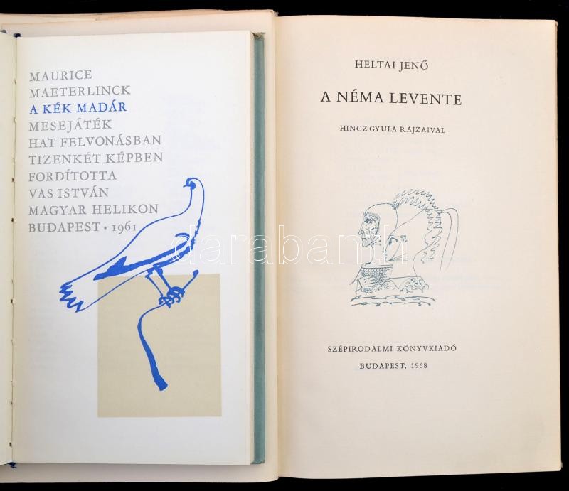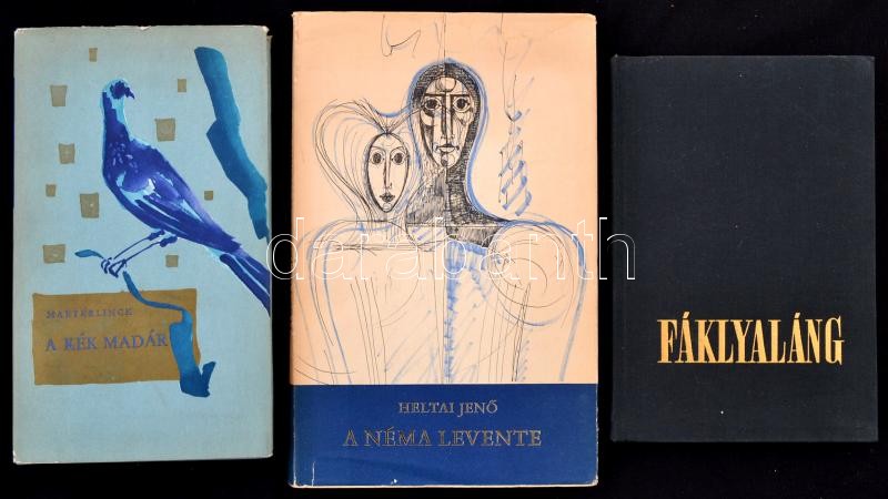 Vegyes könyv tétel, 3 db: Heltai Jenő: A néma levente. Hincz Gyula rajzaival. Bp., 1968, Szépirodalmi. Kiadói kartonált papírkötés, kiadói papír védőborítóban. Illyés Gyula: Fáklyaláng. Bp.,1968, Szépirodalmi. Kiadói egészvászon-kötés. Maurice Maeterlinck: Kék madár. Bp.,1961, Magyar Helikon. Kiadói egészvászon-kötés, kiadói papír védőborítóban.