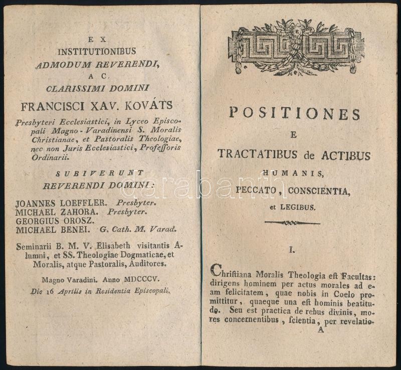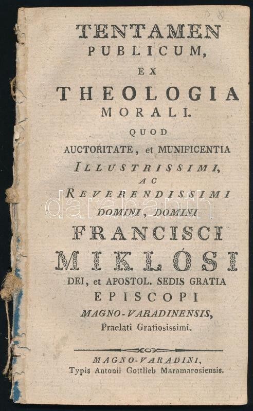 Kováts Ferenc Xaver (1743-1810): Tentamen Publicum, ex Theologia Morali. Quod Auctoritate, et Munificentia Illustrissimi, ac Reverendissimi. Domini, Domini Francisci Miklósi Dei, et Apostol. Sedis Gratia Episcopi Magno-Varadienensis, Praelati Gratiosissimi. Positiones e Tractatibus de Actibus Humanis, Peccato, Conscientia, et Legibus. Magno-Varadini (Nagyvárad),(1805), Typis Antonii Gottlieb Maramarosiensis (Máramarosi Gottlieb Antal), 1 sztl. lev.+31 p. Fűzött papírkötés, latin nyelven. Kováts Ferenc Xaver (1743-1810) kolozsvári székely szülők gyermeke. Jezsuita szerzetes. A Jezsuita rend feloszlatása után világi pap és a nagyváradi püspöki líceum teológia tanára.
