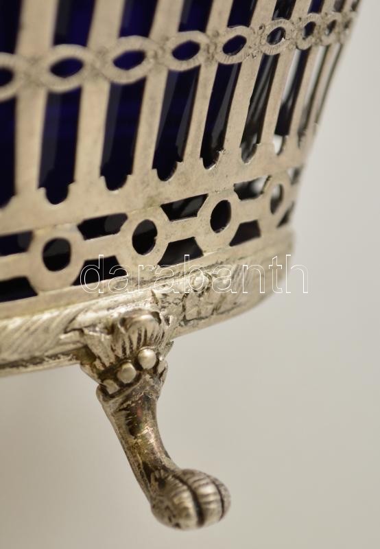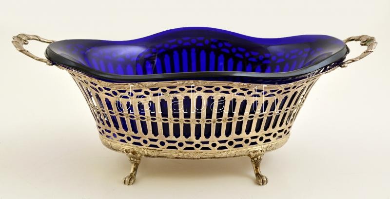 Description: Ezüst (Ag) áttört kínáló, üveg betéttel (apró csorbával) jelzett, mesterjeggyel, 26×14 cm, nettó:259 g / Silver serving dish, with glass bowl (with small notch), hallmarked