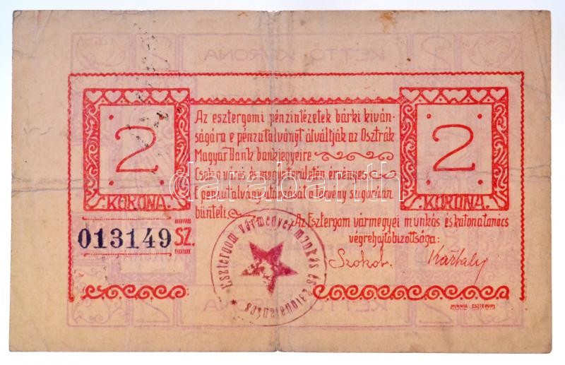 Esztergom 1919. június 10. 2K utalvány, "Esztergom vármegyei munkás és katonatanács" felülbélyegzéssel T:III,III-