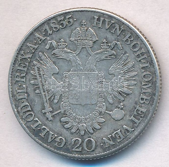 https://www.darabanth.com/en/312-Online-auction/312.0/Numismatics/Hungarian-coins-and-coins-with-Hungarian-mint-marks~400008/1835B-20kr-Ag-I-Ferenc-Kormocbanya-6-59g-T2-Hungary-1835B-20-Kreuzer-Ag-Franz-I-Kremnitz~II1707408