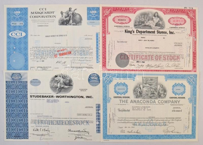 Amerikai Egyesült Államok 1967-1978. 10db-os vegyes részvény tétel, benne "King's Department Stores", "CCI Marquard Corporation", "The Anaconda Company", "Studebaker-Worthington", "United Park City Mines" és "Food Fair Stores" nagyrészt bélyegzésekkel, perforációval érvénytelenítve T:II-,III USA 1952-1978. 10pcs of shares, including "King's Department Stores", "CCI Marquard Corporation", "The Anaconda Company", "Studebaker-Worthington", "United Park City Mines" and "Food Fair Stores", mainly with cancellations and invalidated with perforations C:VF,F