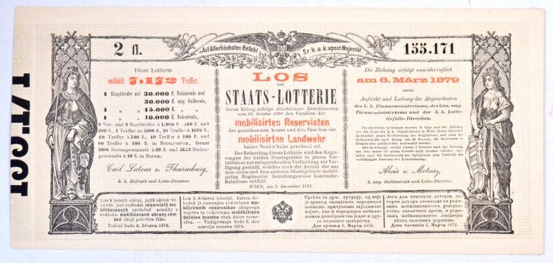 Ausztria / Bécs 1878. "Sorsjegy állam-sorsjátékra a közös hadsere... https://www.darabanth.com/en/312-Online-auction/312.0/Numismatics/Shares-and-Tickets~400005/Ausztria-Becs-1878-Sorsjegy-allam-sorsjatekra-a-kozos-hadsereg-mozgositott-tartalekosai~II1524391