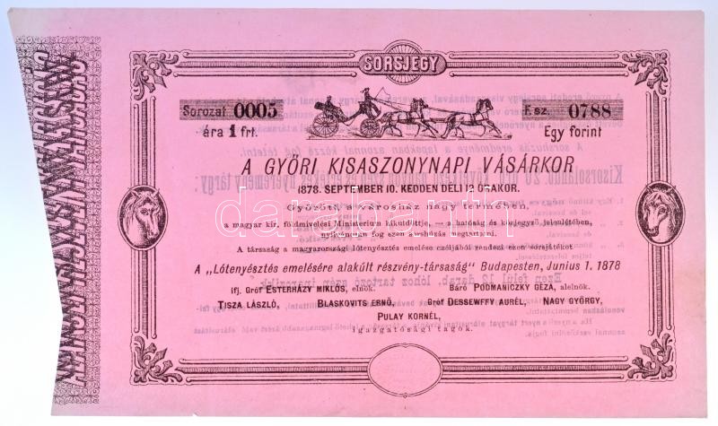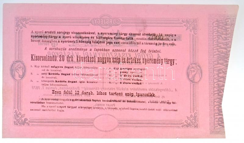 Budapest 1878. "Lótenyésztés emelésére részvény-társaság - A győri kisasszonynapi vásárkor" sorsjegy 1Ft értékben, szárazpecséttel T:III