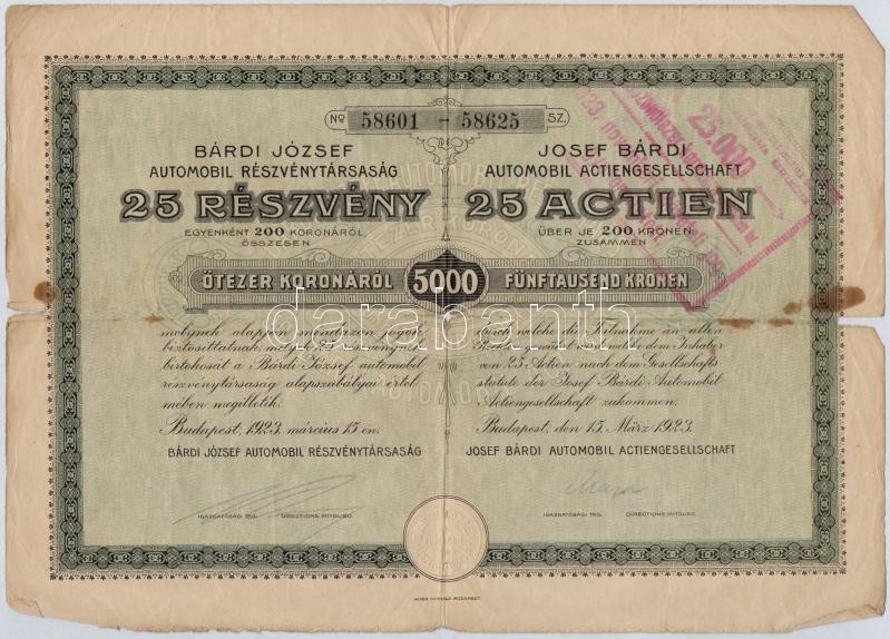 https://www.darabanth.com/en/312-Online-auction/312.0/Numismatics/Shares-and-Tickets~400005/Budapest-1923-Bardi-Jozsef-Automobil-Reszvenytarsasag-25-reszvenye-egyben-osszesen-5000K~II1709755