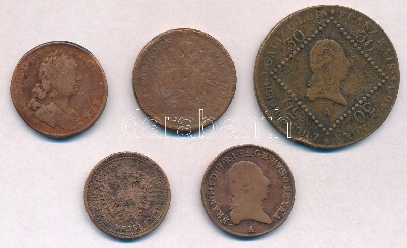 Ausztria 5db-os rézpénz tétel, vegyes tartásban, benne: 1760W 1kr, 1800A 1kr, 1807A 30kr, 1851A 1kr és 1861A 4kr T:2-3- Austria 5pcs of copper coins, in mixed quality, with: 1760W 1 Kreuzer, 1800A 1 Kreuzer, 1807A 30 Kreuzer, 1851A 1 Kreuzer és 1861A 4 Kreuzer C:VF-VG