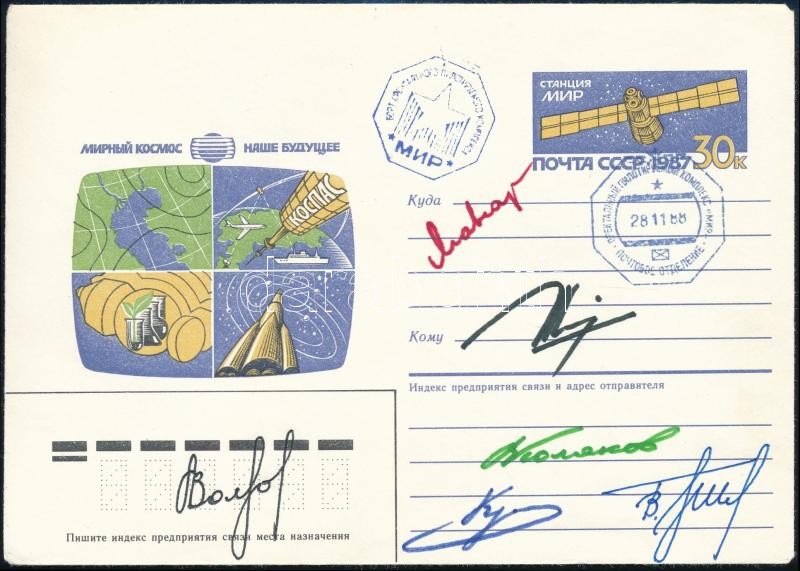 Alekszandr Volkov (1948- ), Szergej Krikalev (1958- ), Valerij Poljakov (1942- ), Vlagyimir Tyitov (1947- ) és Oleg Makarov (1933-2003) szovjet és Jean-Loup Chrétien (1938- ) francia űrhajósok aláírásai emlékborítékon /