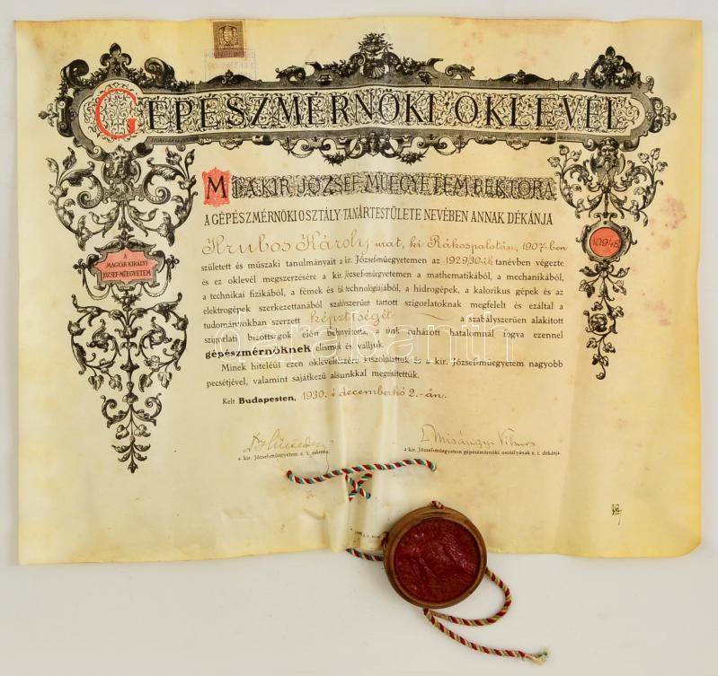 Description: 1930 M. Kir. József-Műegyetem díszes gépészmérnöki oklevél, Hütl Dezső (1870-1946) építésznek, az egyetem rektorának, és Misángyi Vilmos gépészmérnök, az egyetem dékánjának aláírásaival, okmánybélyeggel, fatokos függőpecséttel, gyűrött.