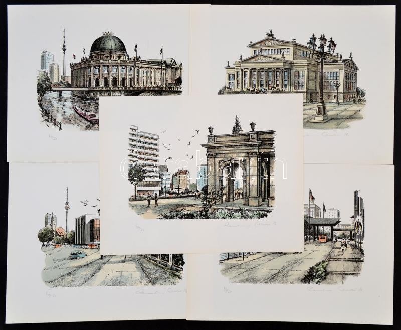 Kelet-Berlin 5 db kézzel színezett, jelzett linómetszet mappában. / Ea...