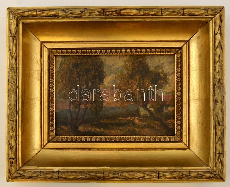 P.I.jelzéssel: Ház a fák mögött. Olaj, falemez, keretben, 15,5×22,5 cm