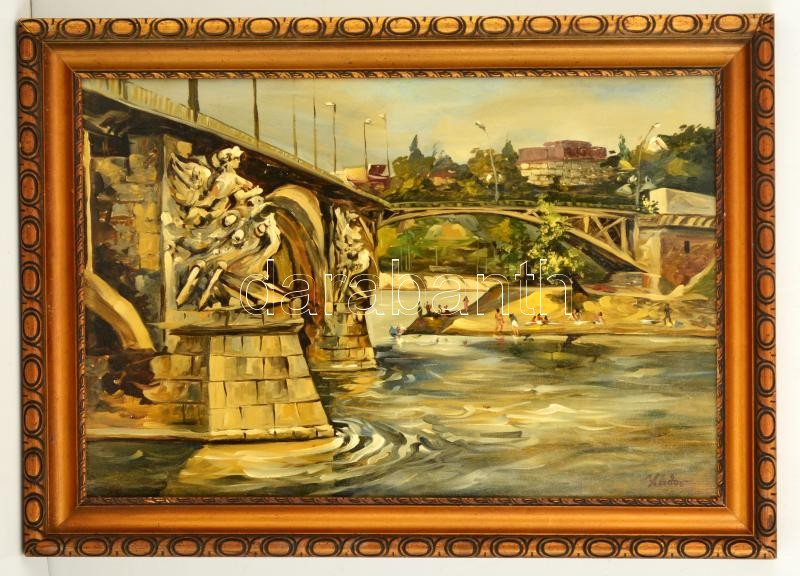 Zádor jelzéssel: Margit hídi napozók. Olaj, falemez, keretben, 40×60 c...