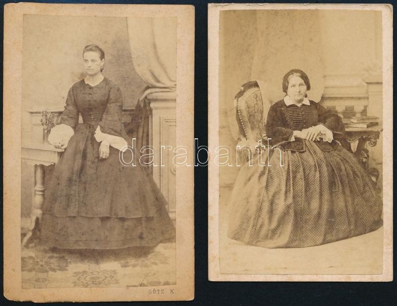 cca 1861 Női divat, 2 db vizitkártya méretű fénykép, 9,5x5 cm és 10x6,...