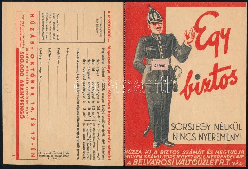 cca 1930 Egy biztos sorsjegy reklámnyomtatvány