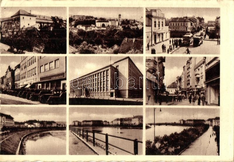Ungvár, Uzshorod, Uzhorod; mozaiklap: buszmegálló, automobilok, autóbuszok, utcaképek / mutli-view postcard: bus station, autobuses, automobiles, street views (EK)