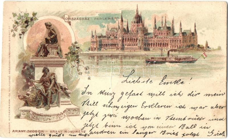 1898 Budapest, Országház (Parlament), Arany János-szobor. Magyar Automatagyár és Kölcsönző Rt. Art Nouveau litho (fa)