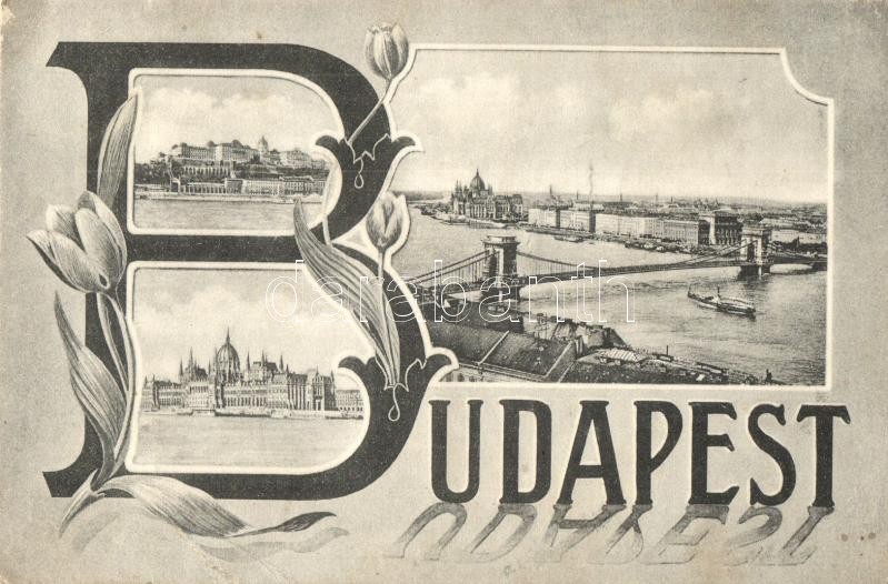 Budapest, Lánchíd, Királyi vár, Parlament. iniciálés Art Nouveau lap (...