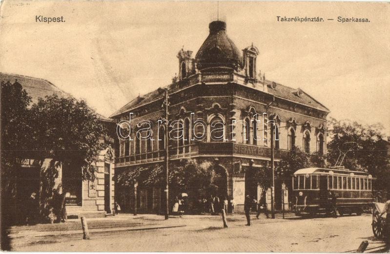 Budapest XIX. Kispest, Takarékpénztár, Stefány Ede kávéháza, bor- és sörcsarnoka, üzlet, villamos (EK)