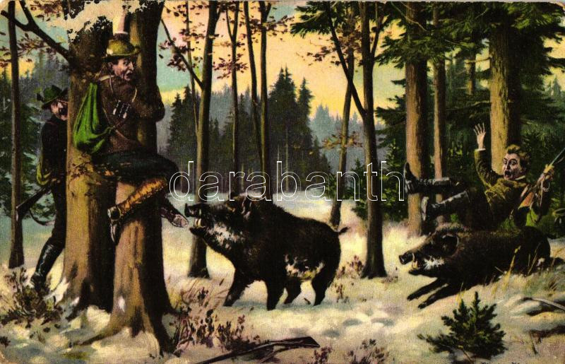 Hunters, wild boars, humour, P.V.K.Z. Serie 1059/4., artist signed (EB...