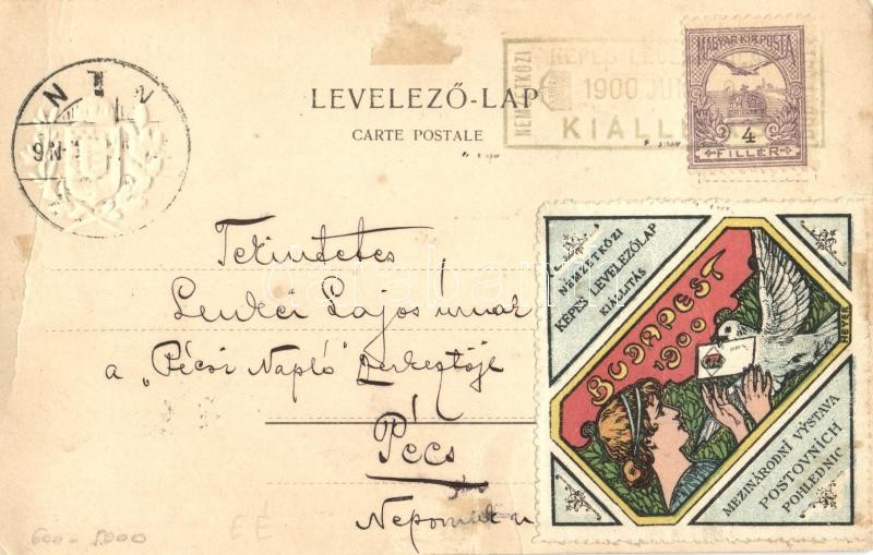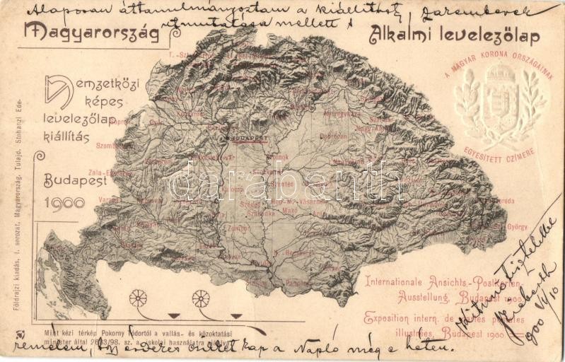Description: Magyarország. A m. korona országainak egyesített címere. Földrajzi kiadása I. sorozat (tulajdonos Stohanzl Ede). Kiadó Aigner János. Nemzetközi képes levelezőlap kiállítás Budapest 1900. / Kingdom of Hungary, International Postcard Exhibition. Emb. coat of arms. + Nemzetközi Képes Levelezőlap Kiállítás So. Stpl. (EB)