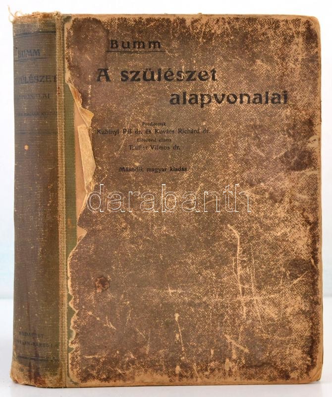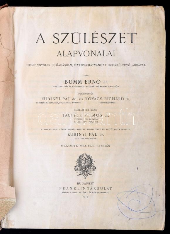 Bumm Ernő: A szülészet alapvonalai. Ford. Dr. Kubinyi Pál és Dr. Kovács Richárd. Ajánlást írt hozzá Tauffer Vilmos. A kilenczedik német kiadás szerint kibővítette és sajtó alá rendezte dr. Kubinyi Pál. Bp., 1915, Franklin. Második, magyar kiadás. Kiadói egészvászon-kötés, rossz állapotban, kopottas, sérült borítóval, sérült kötéssel, a könyvtest elvált a borítótól, foltos lapokkal.