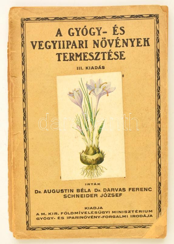 Dr. Augustin Béla, Dr. Darvas Ferenc, Schneider József: A gyógy-, és vegyiipari növények termesztése. Bp., 1922, M. Kir. Földmívelésügyi Minisztérium Gyógy-, és Iparinövény-forgalmi Irodája, "Pátria" Irodalmi Vállalat és Nyomdai Rt. II. kiadás. Kiadói papírkötés, elöl levált papírborítóval, szövegközti fekete-fehér illusztrációkkal.