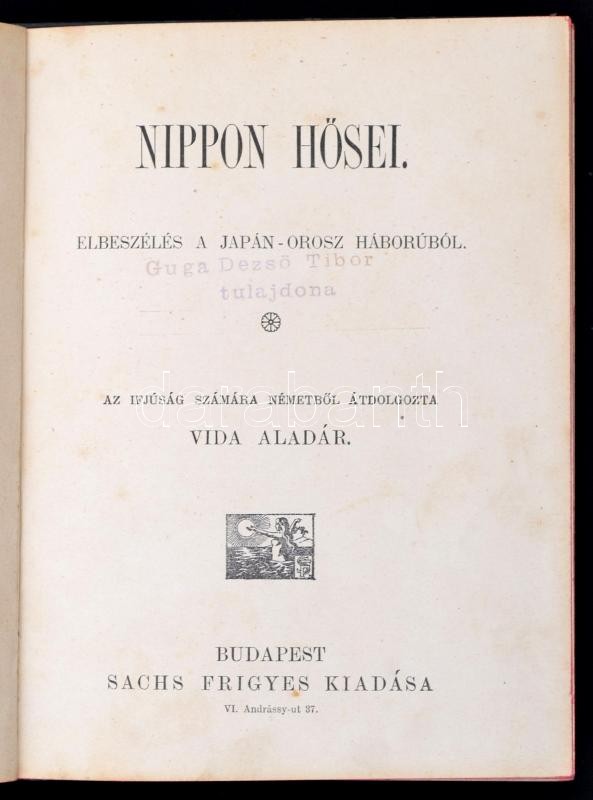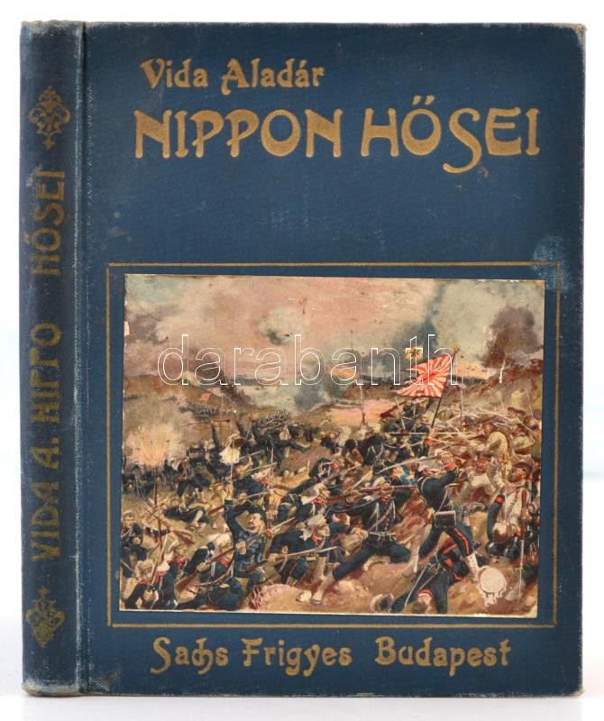 Description: Nippon hősei. Elbeszélés a japán-orosz háborúból. Az ifjuság számára németből átdolgozta Vida Aladár. Bp.,[1906], Sachs Frigyes, Neuwald Illés-ny. Kiadói aranyozott, illusztrált egészvászon-kötés, kopottas borítóval, de belül jó állapotban, festett lapélekkel.