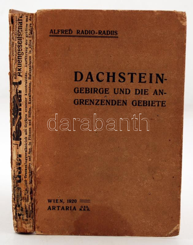 Radio-Radiis, Alfred: Führer durch das Dachsteingebirge und die angrenzenden Gebiete des Salzkammergutes und Ennstales. Bécs, 1920, Artaria. Számos fekete-fehér fényképpel. Kissé foltos vászonkötésben, gerince hiányzik.