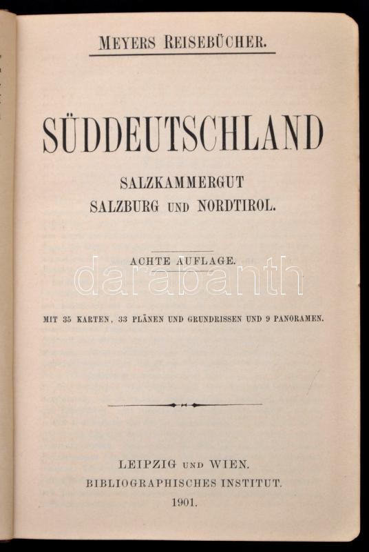 Süddeutschland. Salzkammergut, Salzburg und Nordtirol. Meyers Reisebücher. Leipzig-Wien, 1901, Bibliographisches Institut, XII+423+80 p. Nyolcadik kiadás. Kiadói aranyozott egészvászon-kötés, német nyelven, térképekkel illusztrálva./ Süddeutschland. Salzkammergut, Salzburg und Nordtirol. Meyers Reisebücher. Leipzig-Wien, 1901, Bibliographisches Institut, XII+423+80 p. Eighth edition. Linen-binding, in German language, with maps.