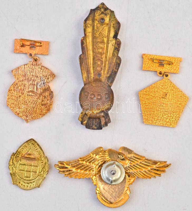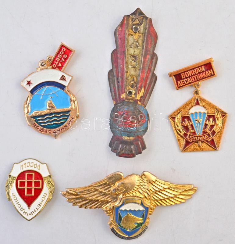 Description: Szovjetunió 5db-os vegyes kitüntetés, jelvény és fém felvarró tétel, közte véradó, ejtőernyős és tengeralattjárós jelvények T:1-3