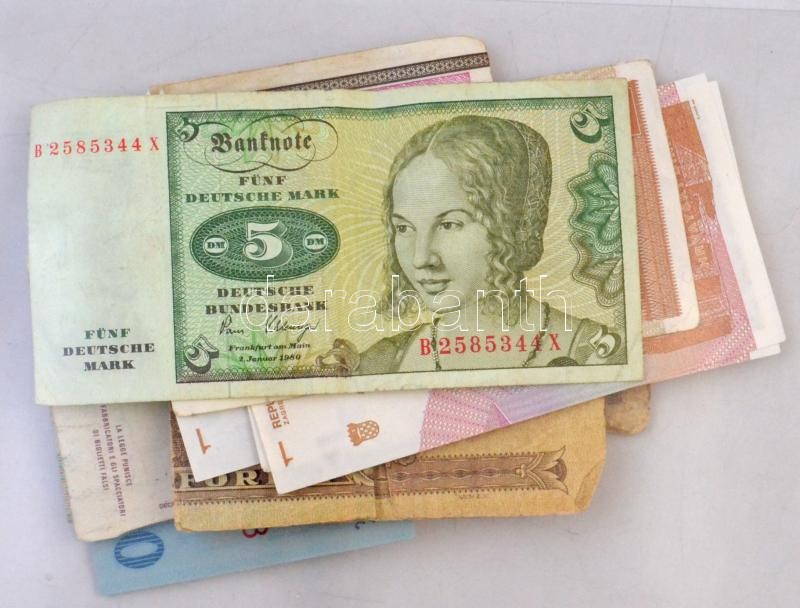 Vegyes magyar és külföldi fémpénz tétel ~1,5kg-os súlyban, mellette 10db külföldi bankjegy, közte NSZK 1980. 5M T:vegyes