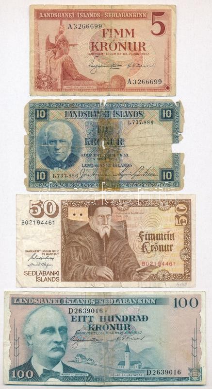 Iceland 1928. 10 Krónur + 1957. 5 Krónur + 100 Krónur + 1961. 50 Krónur C:VG,G tear, sticked