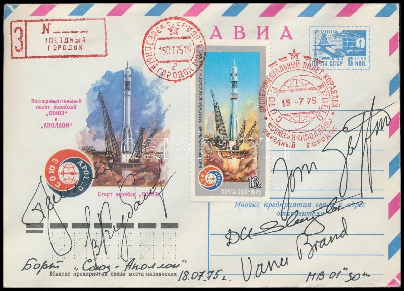 1975 A Szojuz-Apollo program résztvevőinek aláírásai emlékborítékon: Alekszej Leonov (1934- ), Valerij Kubaszov (1935-2014), Thomas P. Stafford (1930- ), Vance D. Brand (1931- ) és Deke Slayton (1924-1993) /