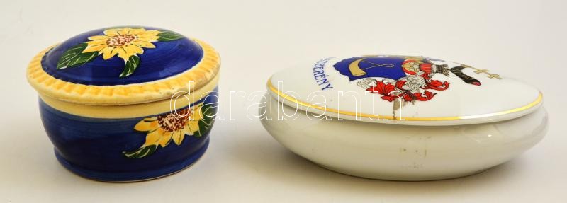 Description: Hollóházi bonbonier Jászberény címerével,matricás, jelzett, kopásokkal, 16×9×5 cm + virágos kerámia bonbonier, jelzés nélkül, kis kopásokkal, d: 9,5 cm