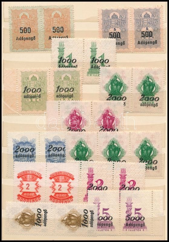 1946 Adópengő címletű okmánybélyegek, párok és összefüggések, összesen...