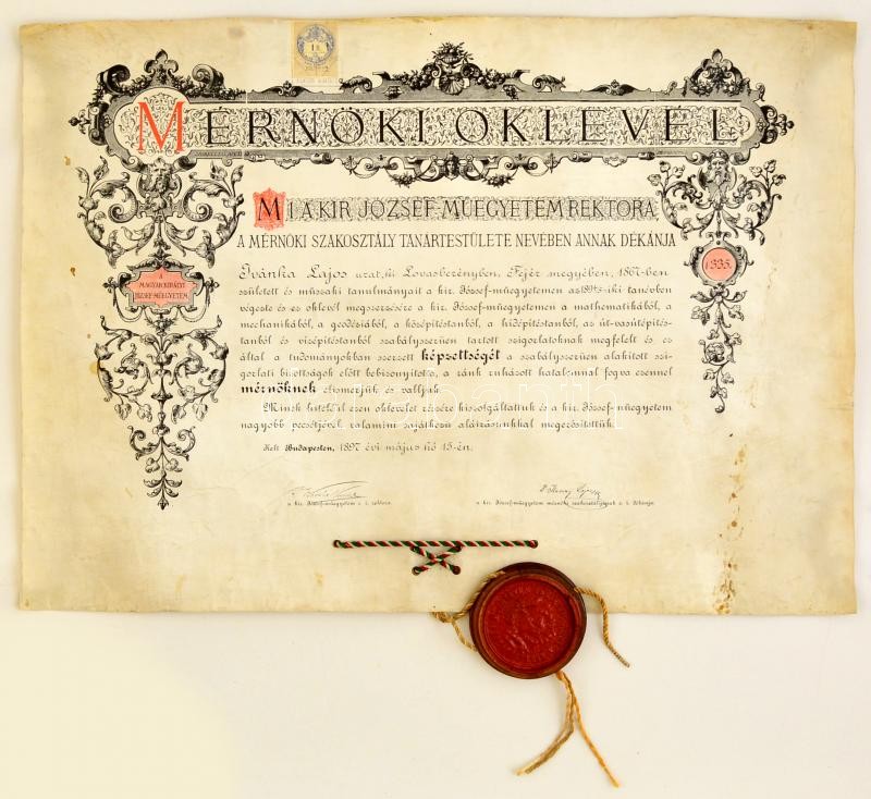 1897 A Magyar Királyi József-Műegyetem gépészmérnöki díszes oklevele W... https://www.darabanth.com/en/313-Online-auction/313.0/Other-collectibles/Documents~18/1897-A-Magyar-Kiralyi-Jozsef-Muegyetem-gepeszmernoki-diszes-oklevele-Wartha-Vince-1844-1914~II1718139