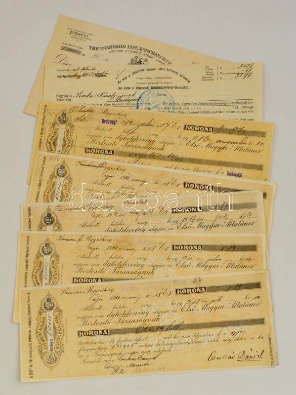 Description: 1900-1919 Első Magyar Általános Biztosító Társaság (5 db), Első O. Általános Baleset Ellen Biztosító Társaság (1 db), The Standard Lifeassurance Company díjkötelezvényei (1db), 7 db,