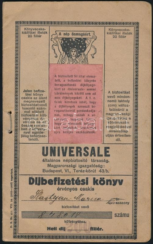1919 Universale Általános Népbiztosító Társaság díjbefizetési könyve, ...