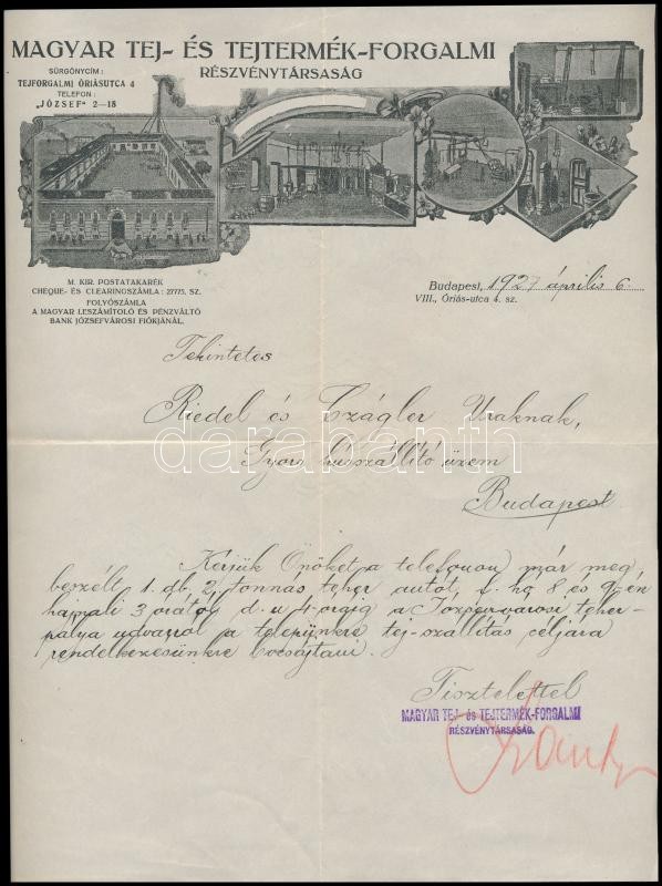 1927 Magyar Tej- és Tejtermékforgalmi Rt. díszes fejléces levél, 29x22...