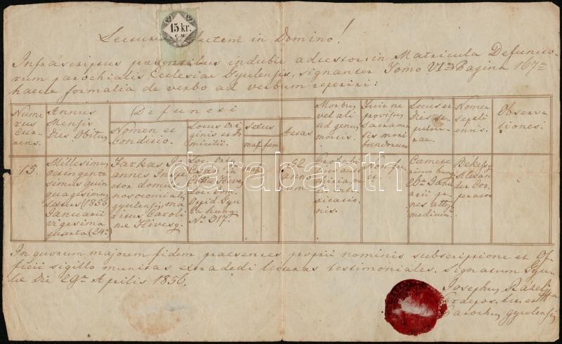 Gyula 1856 Halotti anyakönyv kivonat 15kr C.M. okmánybélyeggel