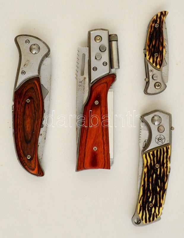 Jelzett vadászkések, több funkciósak elemlámpával (egy működik), összesen: 4db, összecsukva: 8-14,5 cm