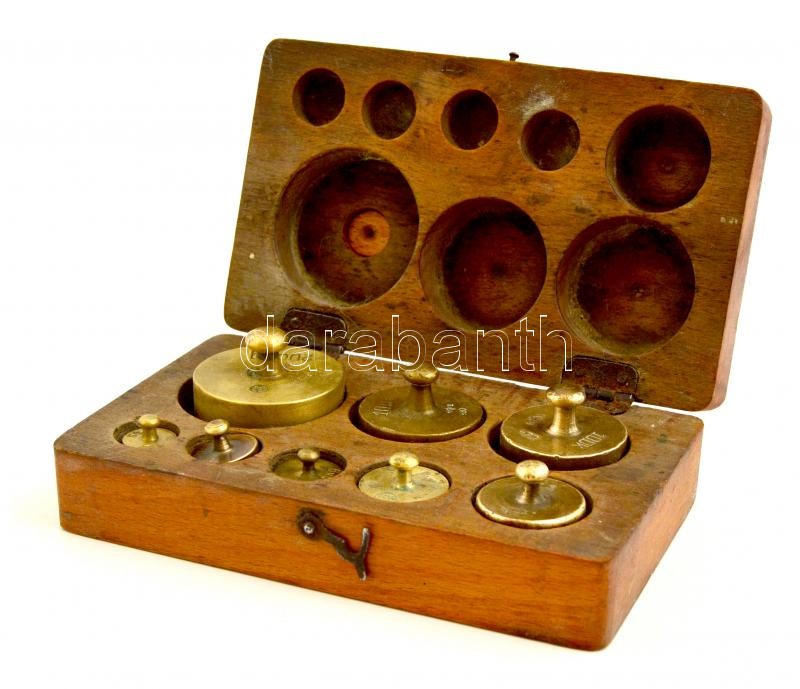 Koronás réz súlykészlet, saját fa dobozában, 14x8x4 cm