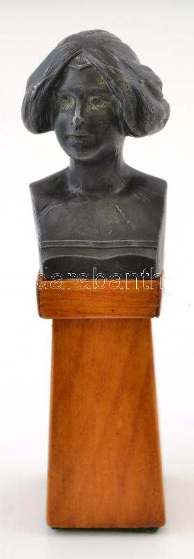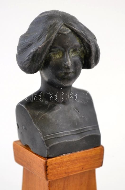 Ón szecessziós női büszt, jelzés nélkül, fa talapzaton, m: 11,5 cm
