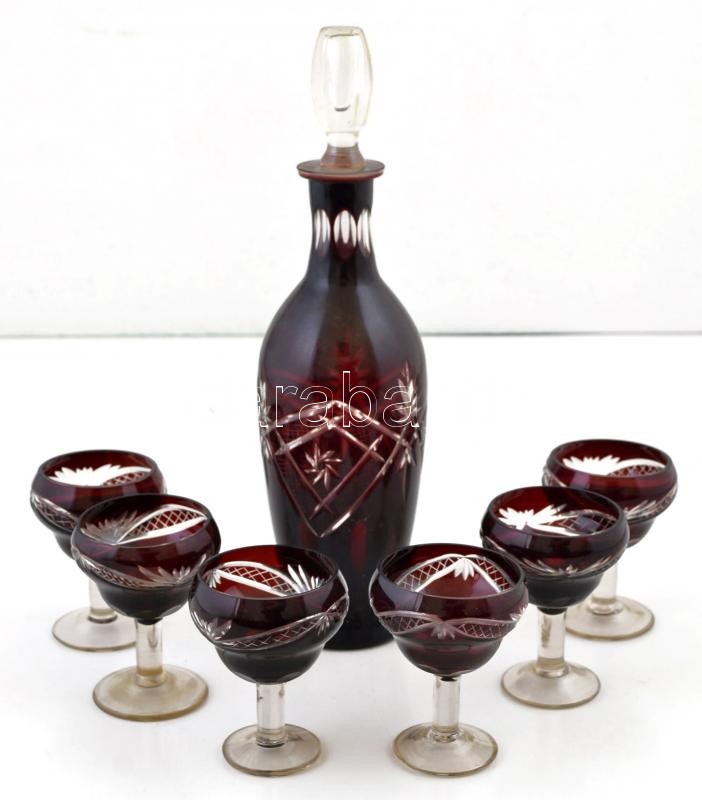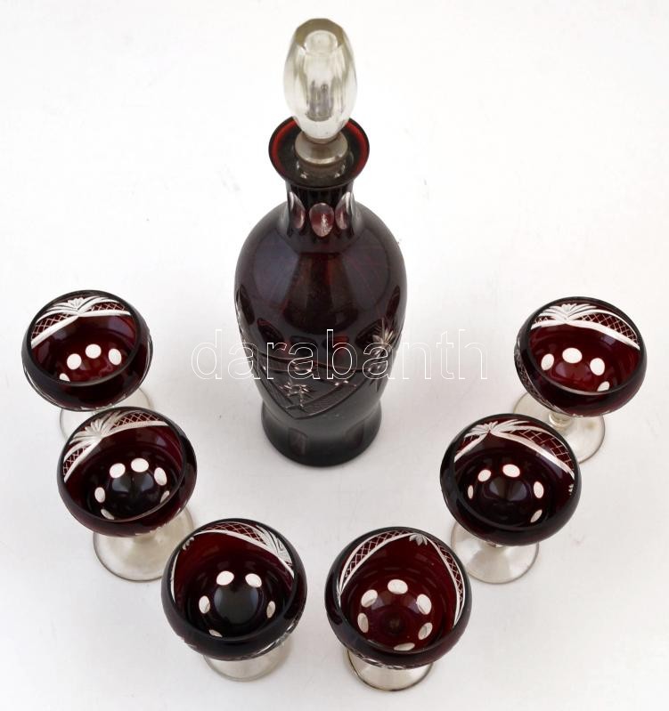 Likőrös készlet, 6 db pohár + kiöntő, kétrétegű, hámozott, metszett, apró lepattanással, kopásnyomokkal