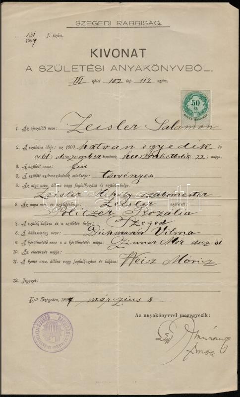 https://www.darabanth.com/en/313-Online-auction/313.0/Other-collectibles/Judaica~25/1897-Szegedi-Rabbisag-altal-kiadott-szuletesi-anyakonyvi-kivonat-50kr-okmanybelyeggel-pecsC3~II1717818