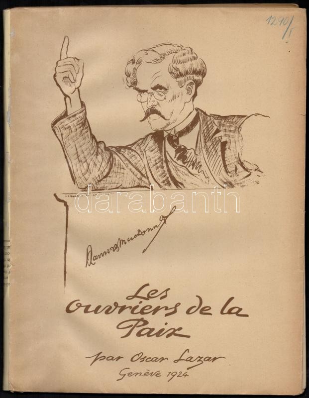 Description: Lazar, Oscar (Lázár Oszkár) (1890-?) : Les ouvriers de la Paix: 20 db lithográfiát tartalmazó mappa. Aláírt, dedikált, hozzá saját kézzel írt levele Lenkey Gyusztáv főszerjesztőnek (Magyar Hírlap, Pesti Hírlap...) melyben a svájcba szakadt magyar emigránsokat és professzoraikat ábrázoló rajzokat tartalmazó munkáját ajánlja. 26x34 cm